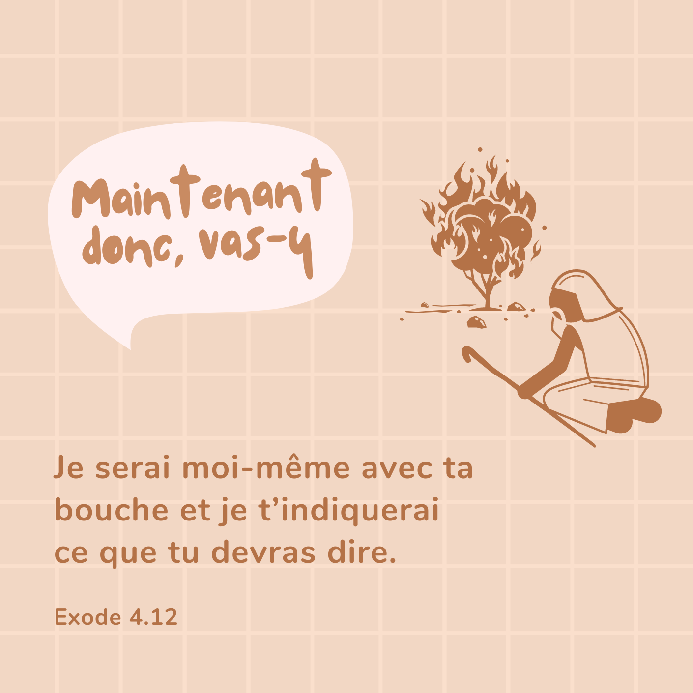 🙏 Prière : Seigneur tu as appelé Moïse et tu m’appelles moi aujourd’hui à faire de bonnes œuvres et à servir. Ne permets pas que je doute de ta capacité à pourvoir complètement à ce que tu demandes. Que je place ma confiance en toi, que peu importe le chemin que je doive emprunter, j’ai confiance que tu pourvoiras et que tu as déjà tout préparé par ta puissance créatrice.