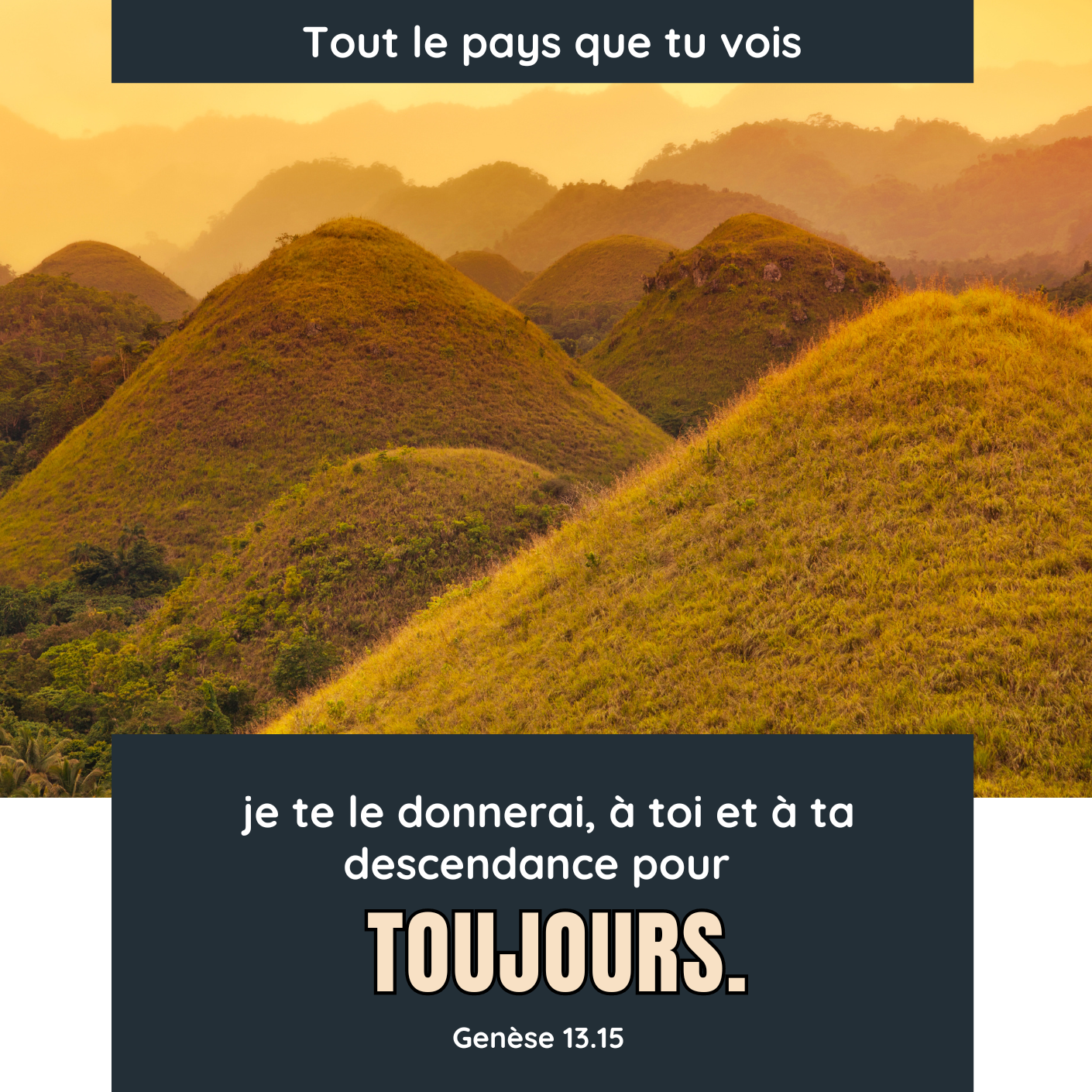 L’Éternel dit à Abram après que Lot se fut séparé de lui : Lève les yeux et regarde depuis l’endroit où tu es, vers le nord, le sud, l’est et l’ouest : tout le pays que tu vois, je te le donnerai, à toi et à ta descendance pour toujours. Je rendrai ta descendance aussi nombreuse que les grains de poussière de la terre ; si l’on peut compter les grains de poussière de la terre, alors on pourra aussi compter ta descendance.