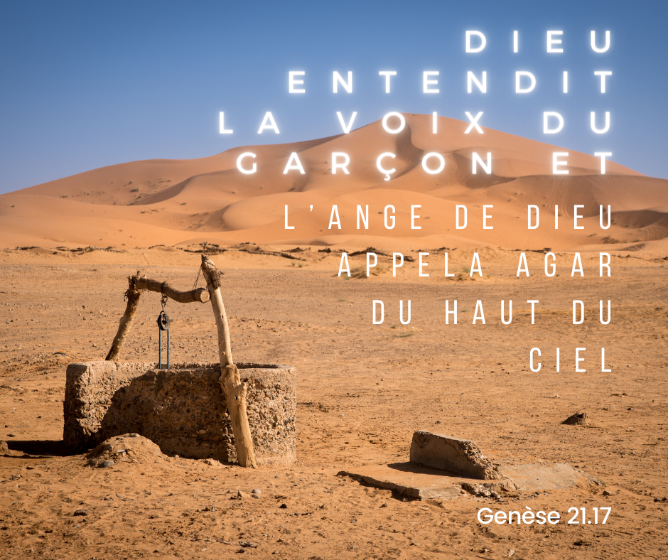 Elle resta assise en face de lui, gémissant et pleurant. Qu’as-tu, Agar ? N’aie pas peur, car Dieu a entendu le garçon là où il est. Dieu lui ouvrit les yeux, et elle aperçut un puits. Elle alla remplir d’eau son outre et donna à boire au garçon.