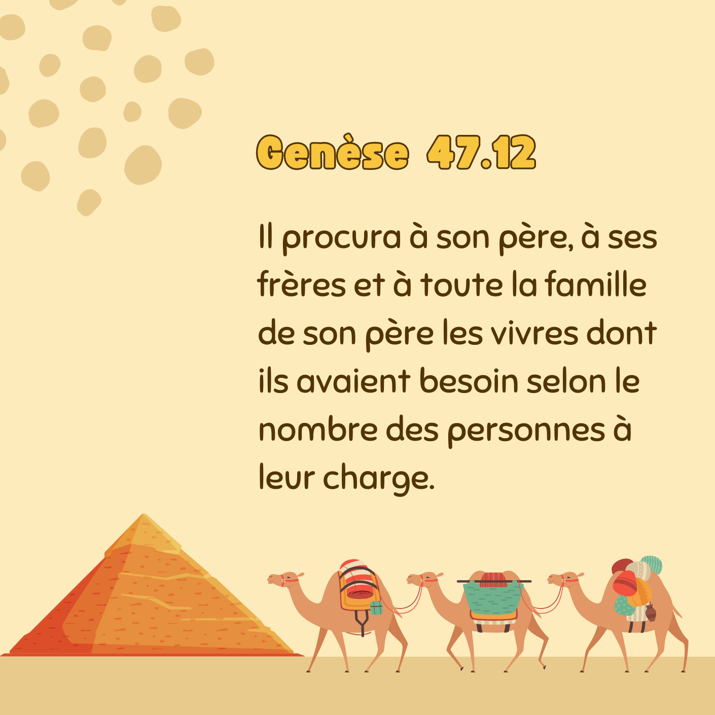 🪶 Joseph met en place un système de partage équitable des récoltes qui permet au peuple de survivre en période de famine tout en assurant les besoins de Pharaon. Il démontre ainsi une sagesse et une gestion justes qui bénéficient à tous. Le peuple juif qui n’avait rien se retrouve avec une terre en Égypte, et les Égyptiens qui avaient tout se retrouvent esclaves de Pharaon. Dieu a le pouvoir de changer toute chose, il donne et il reprend. Dans l’abondance ou le manque, sachons être des gestionnaires sages.