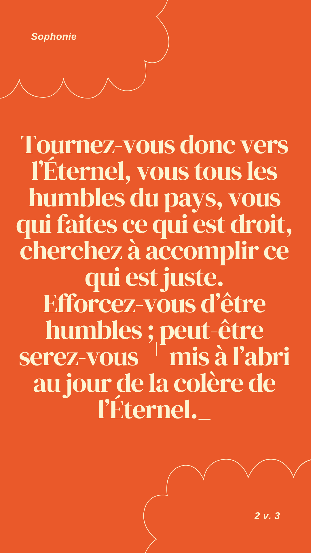 📜 Sophonie 2.3 Tournez-vous donc vers l’Éternel, ╵vous tous les humbles du pays, vous qui faites ce qui est droit, cherchez à accomplir ╵ce qui est juste. ╵Efforcez-vous d’être humbles ; peut-être serez-vous ╵mis à l’abri au jour de la colère ╵de l’Éternel.