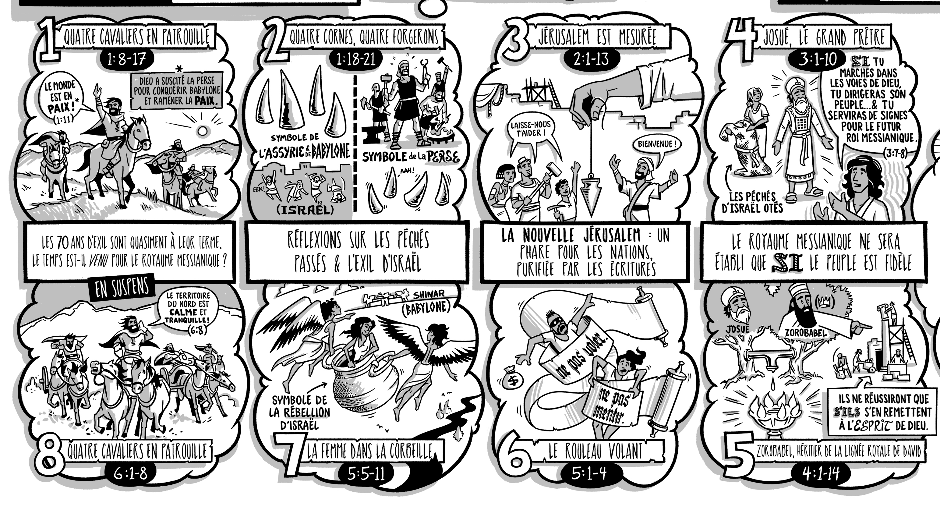 🪶 Chacune des 8 visions nocturnes de Zacharie à sa paire, la première avec la dernière, la deuxième avec la 7ième, la 3ième avec la 6ième et la 4ième avec la 5ième. (Une image vaut mieux que de longs discours !) Et c’est pour cela que nous retrouvons dans cette vision, un parallèle avec le jugement du péché du peuple à Babylone et le couvercle de plomb qui représente aussi la fin du jugement. Dieu a couvert le péché de son amour et de sa justice. Tout est prêt pour la restauration de son peuple et la condamnation des méchants.