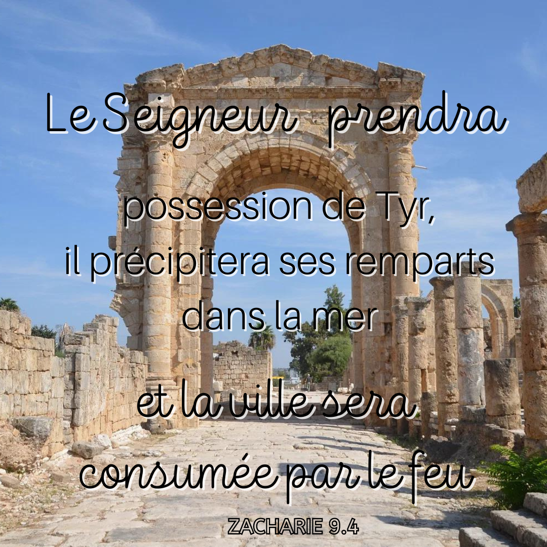 📜 Zac 9.3-4 – Tyr s’est construit pour elle sa forteresse ; elle a accumulé l’argent comme de la poussière, ainsi que l’or comme la boue des rues. Mais voici : le Seigneur en prendra possession, il précipitera ses remparts dans la mer et la ville sera consumée par le feu.